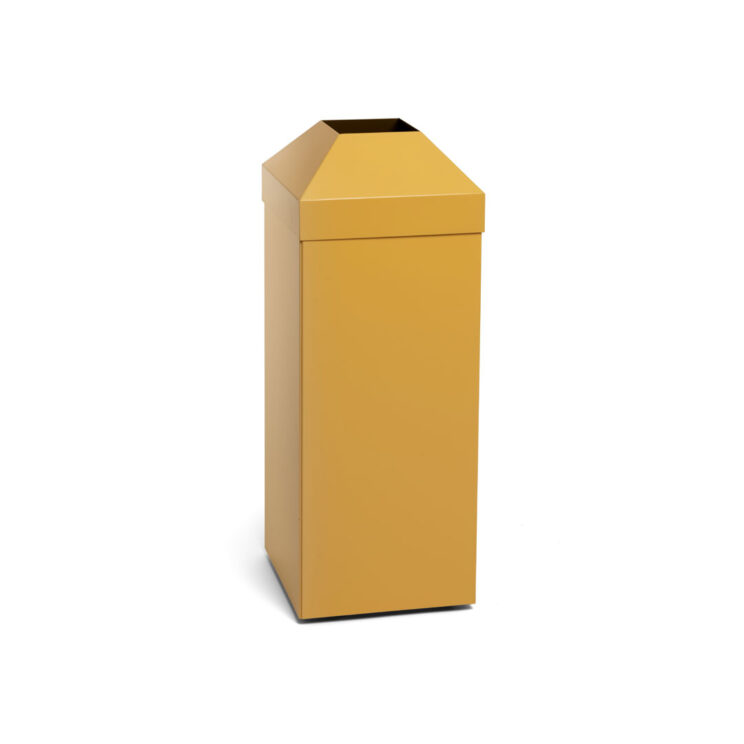 En 70 L plastsäck spänns över kanten och locket håller säcken på plats. Vid tömning dras säcken upp ur tunnan.